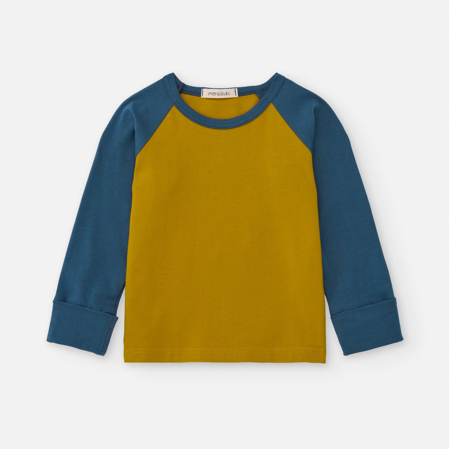 Camiseta unisex en color mostaza con mangas azul, diseñada como un básico atemporal para el armario de tu peque. Confeccionada en algodón suave, transpirable y certificado GOTS, que garantiza una producción orgánica y respetuosa con el medio ambiente.