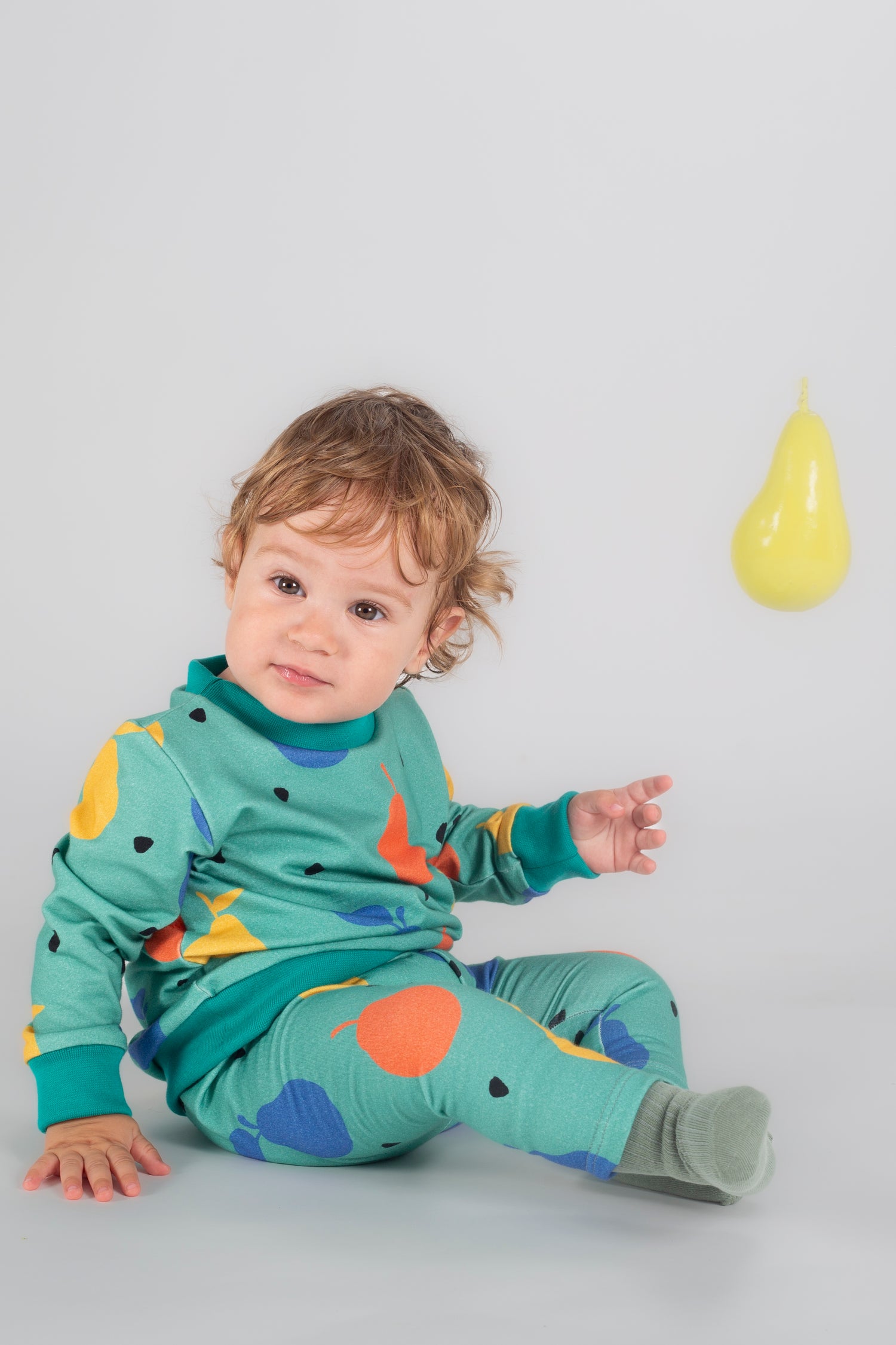 Su estampado exclusivo de peras de colores aporta alegría y originalidad, convirtiéndolo en una pieza divertida y práctica para cualquier look infantil.