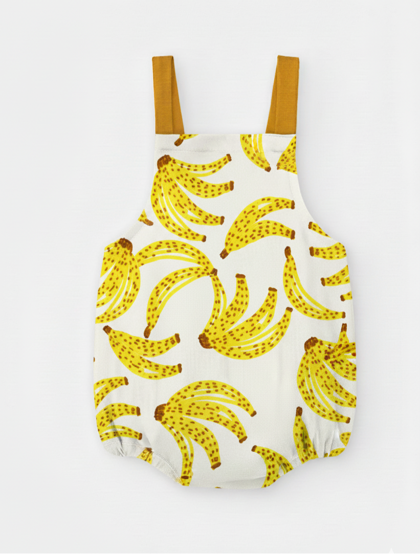 Pelele de verano hecho a mano con tela orgánica, con detalles de estampados de plátanos.